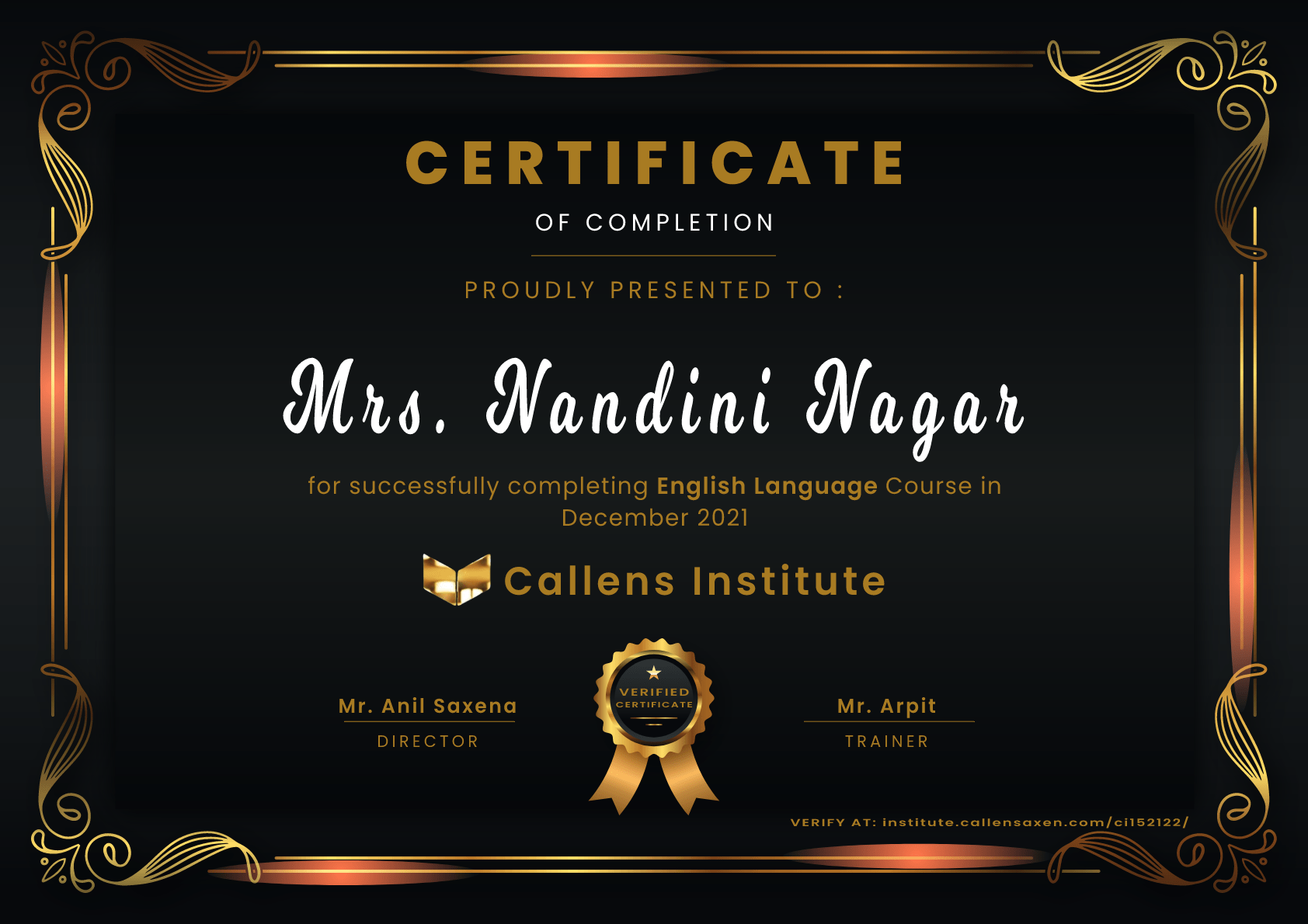 Verified Certificates All the certificates that Callens Institute issues can be verified through the Unique Verification Identity (UVI)